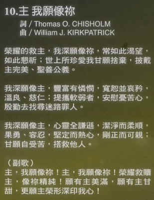 10.主我願像祢 詞/ Thomas C. CHISHOLM 曲/wamJ. KIRKPATRICK 榮耀的救主,我深願像祢,常如此渴望, 如此懇祈,世上所珍愛我甘願捨棄,披戴 主完美丶聖善公義。 我深願像主,豐富有憐憫,宽恕並哀矜, 溫良丶慈仁,提攜軟弱者,安慰憂苦心, 殷勤去找尋迷路罪人。 我深願像主,心靈全謙遜,潔淨而柔顺, 果勇,容忍,堅定而熱心,剛正而可親, 甘願自受苦,搭救他人。 (副歌) 主,我願像祢! 主,我願像祢! 荣耀救贖 主,像祢精純! 願有主美滿,願有主甘 甜,更顯主榮形深印我心! ![]() |
